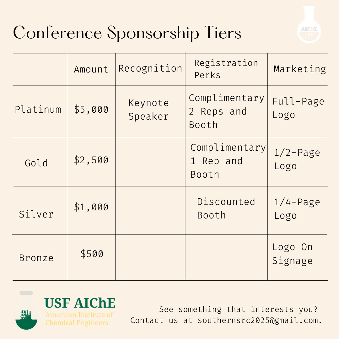 For an overview of our sponsorship tiers, see below. For more information, please contact us at southernsrc2025@gmail.com.